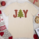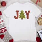 Uroczy design: Choinka jako centralny element napisu „JOY” przyciąga wzrok i wprowadza magiczny, zimowy nastrój.