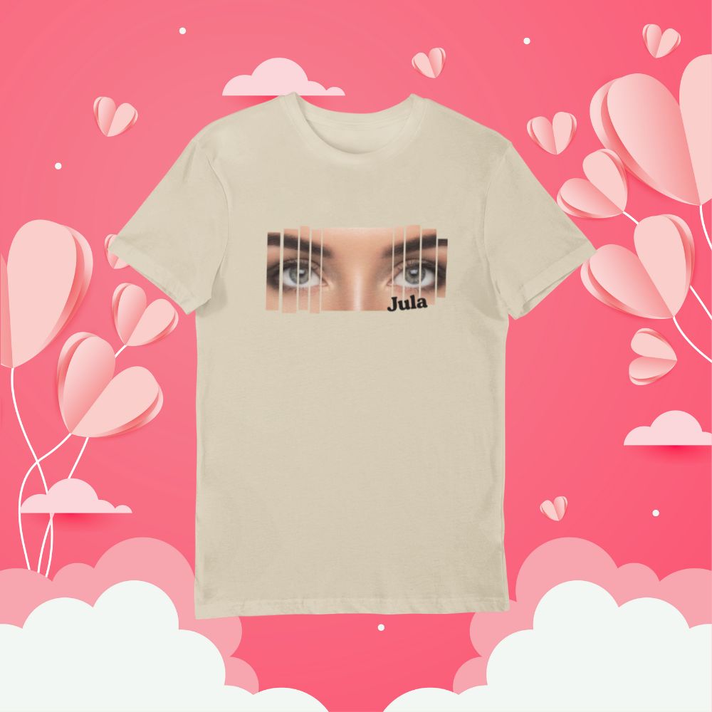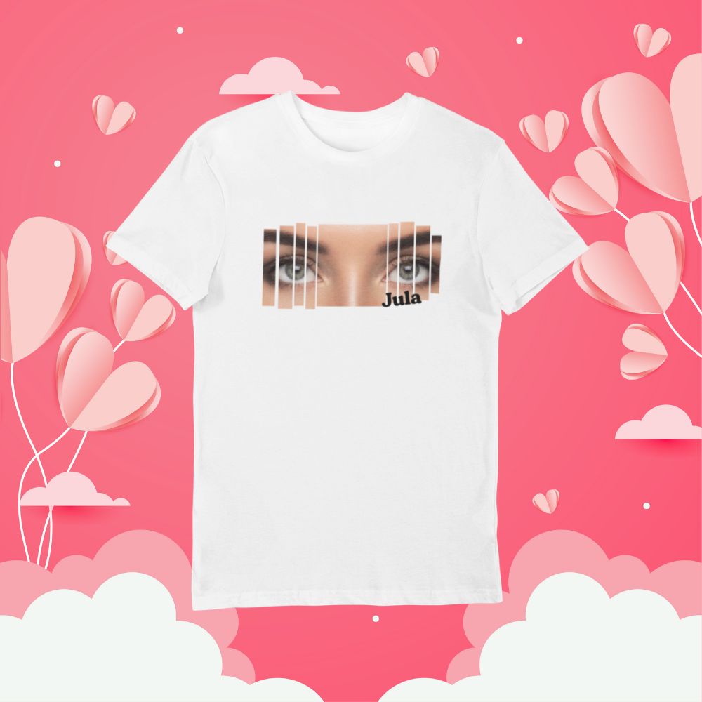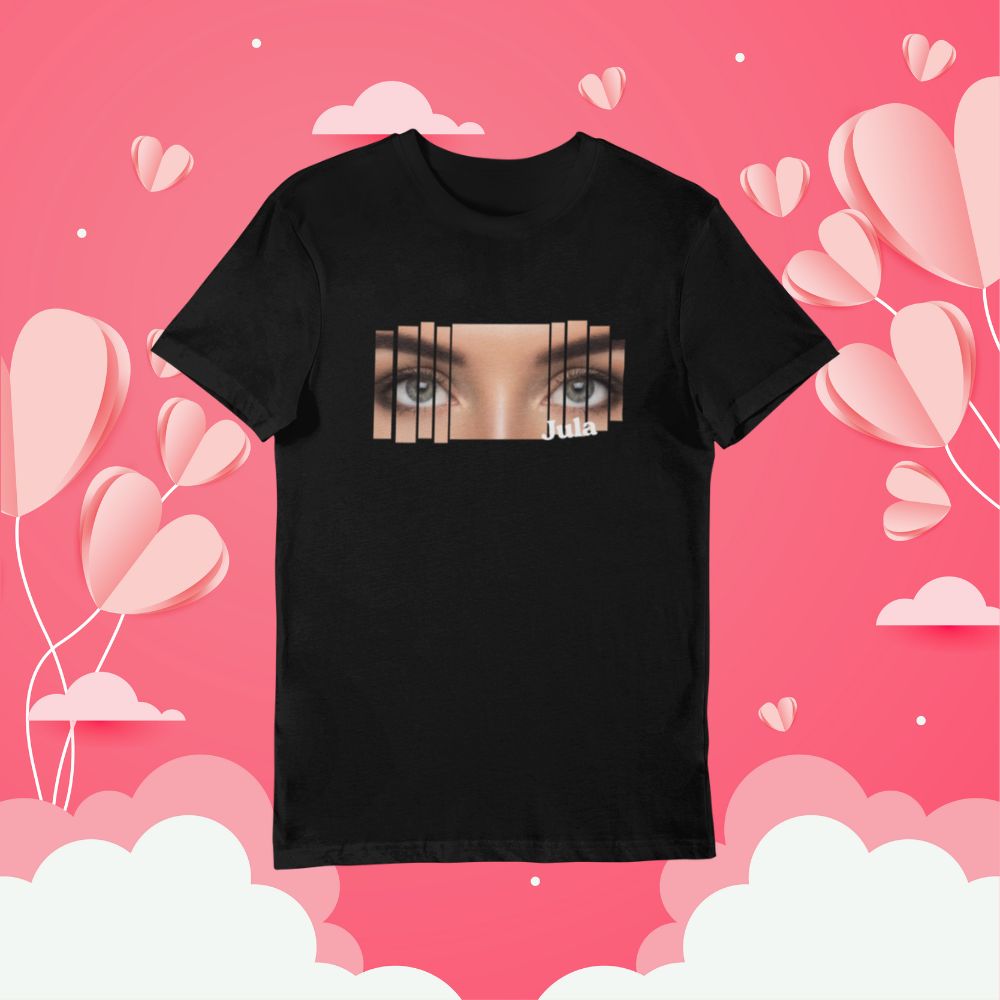 Chcesz nosić coś naprawdę swojego? Ta koszulka to nowoczesny, przyciągający wzrok projekt, w którym główną rolę gra Twoje zdjęcie. Efekt „pasków/kolumn” tworzy stylowy kolaż, który wygląda wyjątkowo na czarnym tle, a całość możesz uzupełnić o imię (np. Julia) lub krótki podpis.